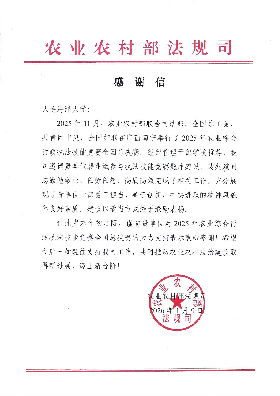 信中指出,2025年11月,农业农村部联合司法部,全国总工会,共青团中央,全国妇联在广西南宁举行了2025年农业综合行政执法技能竞赛全国总决赛。经部管理干部学院推荐,邀请大连海洋大学裴兆斌教授参与执法技能竞赛题库建设。裴兆斌教授勤勉敬业,任劳任怨,高质高效完成了相关工作,充分展现了大连海洋大学干部勇于担当,善于创新,扎实进取的精神风貌和良好素质,并建议以适当方式给予激励表扬。